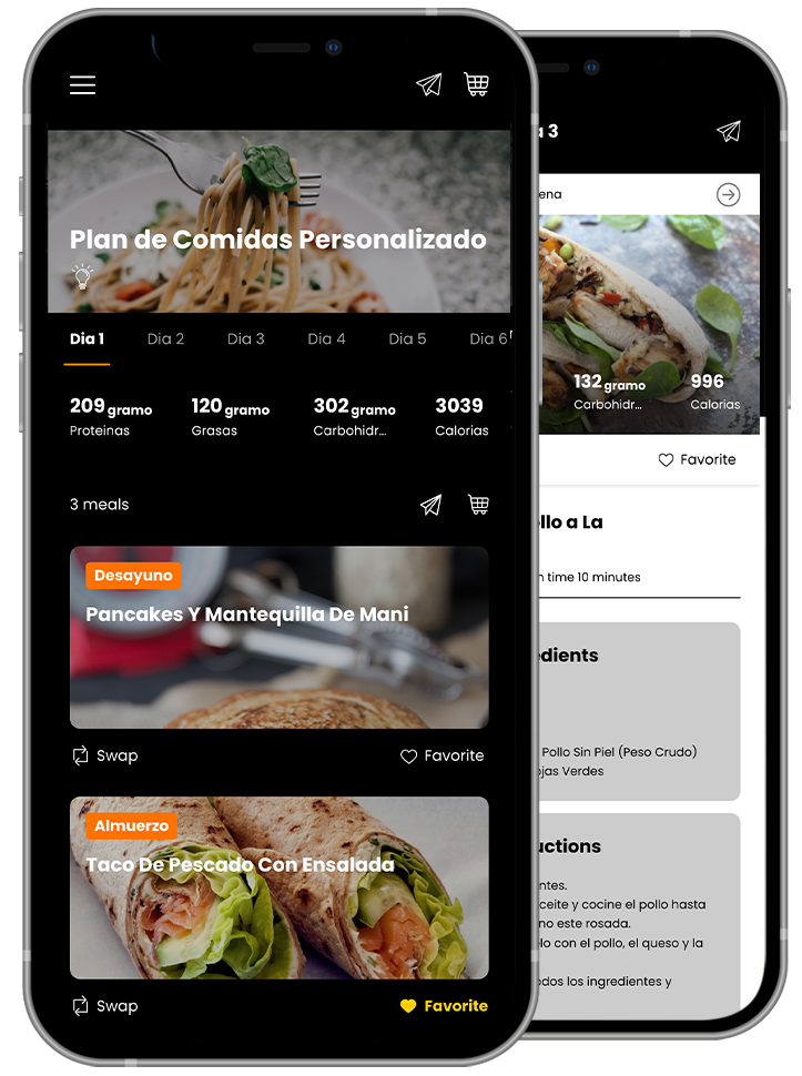 Planes de alimentación totalmente personalizados a TUS objetivos, tu horario y estilo de vida Elige entre comidas generales, vegetarianas, veganas, sin gluten, sin lácteos y más. ¡Todo adaptado a ti!